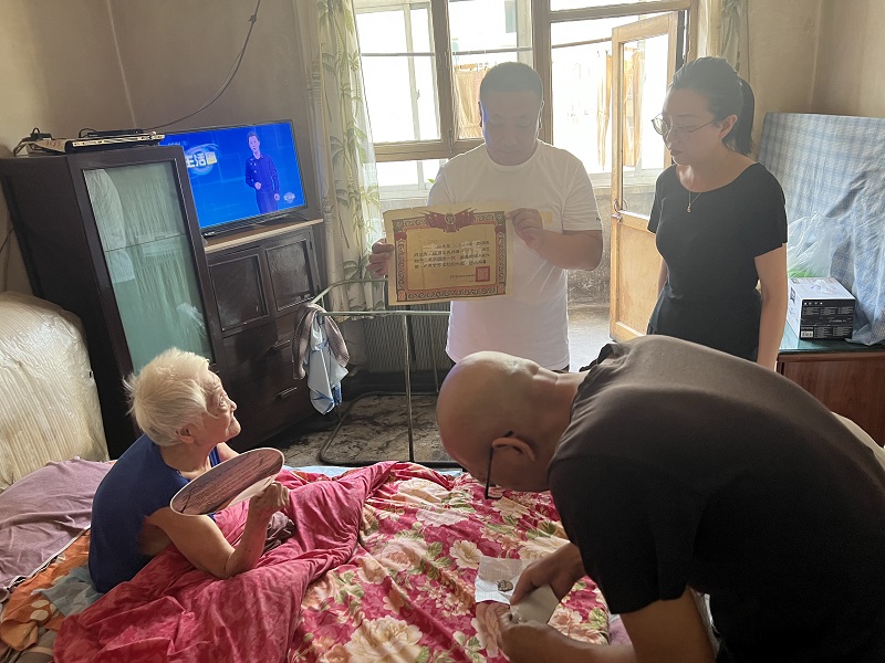 6月28日,安裝公司、物業(yè)公司聯(lián)合旱西關(guān)東社區(qū)工作人員組成慰問小組開展“慰問抗美援朝老兵遺孀 真情傳遞溫暖人心”慰問活動(dòng)?;顒?dòng)中,慰問組一行前往抗美援朝老兵史黑則遺孀家中,詳細(xì)詢問了老人的生活和身體情況,叮囑老人要保重身體、安享晚年,并送去了牛奶、瓜果等慰問品。同時(shí),慰問組一行還看到了保存多年的獎(jiǎng)?wù)录白C書,大家紛紛表示要繼承革命先輩的光榮傳統(tǒng),汲取紅色力量,堅(jiān)定奮進(jìn)步伐,用實(shí)際行動(dòng)迎接黨的二十大勝利召開。