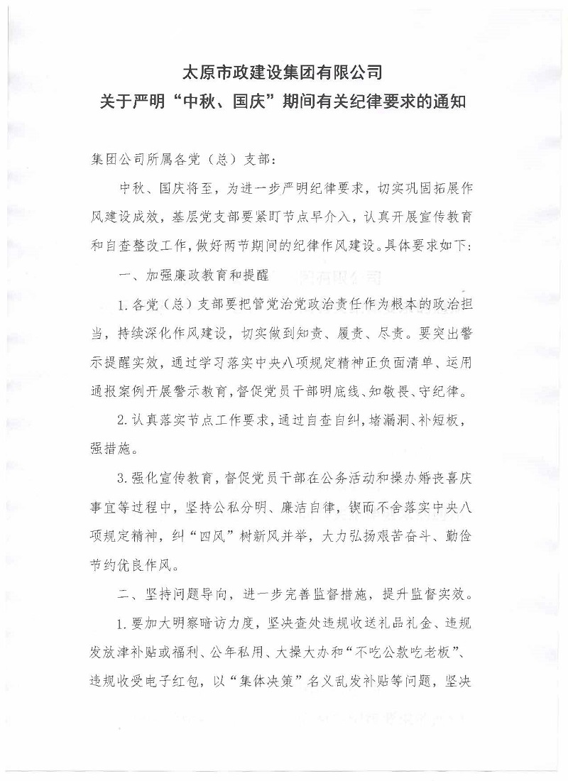 太原市政建設(shè)集團有限公司關(guān)于嚴明“中秋、國慶”期間有關(guān)紀律要求的通知