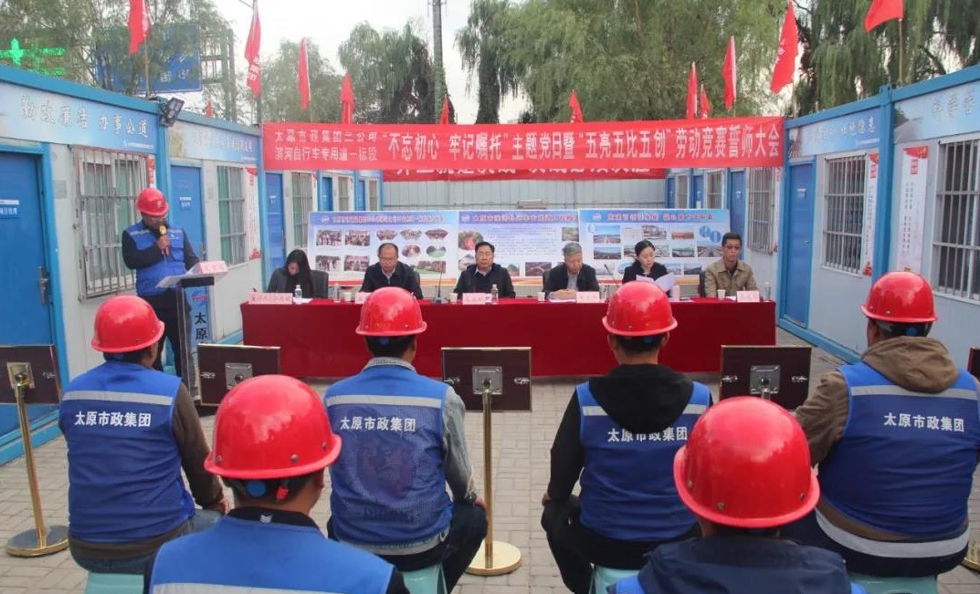 會上,三公司經(jīng)理栗建軍介紹了濱河自行車專用道工程一標(biāo)段工程概況及施工進(jìn)展情況。該工程道路負(fù)責(zé)人、三公司副經(jīng)理柳文斌宣讀了《太原市政集團(tuán)第三工程公司濱河自行車道一標(biāo)段“五亮五比五創(chuàng)”勞動(dòng)競賽實(shí)施方案》。參會領(lǐng)導(dǎo)為以工區(qū)負(fù)責(zé)人姓名命名的5個(gè)工區(qū)授旗,全體參建人員進(jìn)行集體宣誓。集團(tuán)公司勞動(dòng)模范、該工程橋梁負(fù)責(zé)人、三公司副經(jīng)理郝俊軍分享了他的奮斗故事。第七工區(qū)負(fù)責(zé)人武瑞杰代表各工區(qū)進(jìn)行表態(tài)發(fā)言,表示將自我加壓、勇挑重?fù)?dān),為濱河自行車專用道工程決戰(zhàn)攻堅(jiān)貢獻(xiàn)青春智慧和力量。