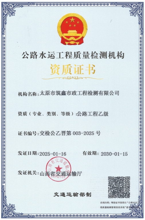 近日,筑鑫公司成功獲得公路水運(yùn)工程質(zhì)量檢測機(jī)構(gòu)“公路工程乙級”資質(zhì)證書。此次資質(zhì)升級,不僅是對筑鑫公司在公路工程檢測領(lǐng)域?qū)I(yè)實(shí)力的有力證明,更是其實(shí)現(xiàn)跨領(lǐng)域發(fā)展的重要里程碑,意味著下一步能夠為公路工程建設(shè)提供更多維度、更具專業(yè)性與精準(zhǔn)度的檢測服務(wù)。