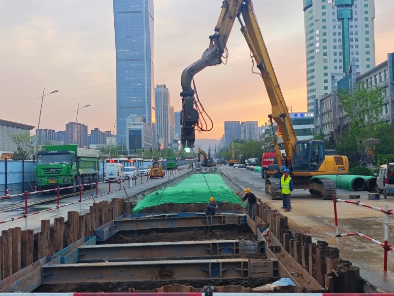 “追求精細極致,鑄就基坑支護的穩(wěn)固防線”。項目部將鋼板樁施打質(zhì)量視為確?;影踩c質(zhì)量的關(guān)鍵環(huán)節(jié),嚴(yán)格執(zhí)行材料準(zhǔn)入制度,所有進場鋼板樁均經(jīng)過材質(zhì)證明核查、尺寸精度測量和外觀質(zhì)量檢驗三重把關(guān),確保樁身無裂紋、無銹蝕等質(zhì)量缺陷,從源頭上杜絕不合格材料。施工中,施工人員采用全站儀進行動態(tài)監(jiān)測,嚴(yán)格控制樁身垂直度偏差在規(guī)定范圍內(nèi),詳細記錄每根樁的打入深度、貫入度等關(guān)鍵參數(shù)。拔樁階段采用專用施工設(shè)備,按照“先支后拆、分段拔除”的原則有序進行,拔樁后出現(xiàn)的孔隙立即灌砂,最大限度減少對周邊土體的擾動,實現(xiàn)平穩(wěn)施工與環(huán)境保護的和諧統(tǒng)一。