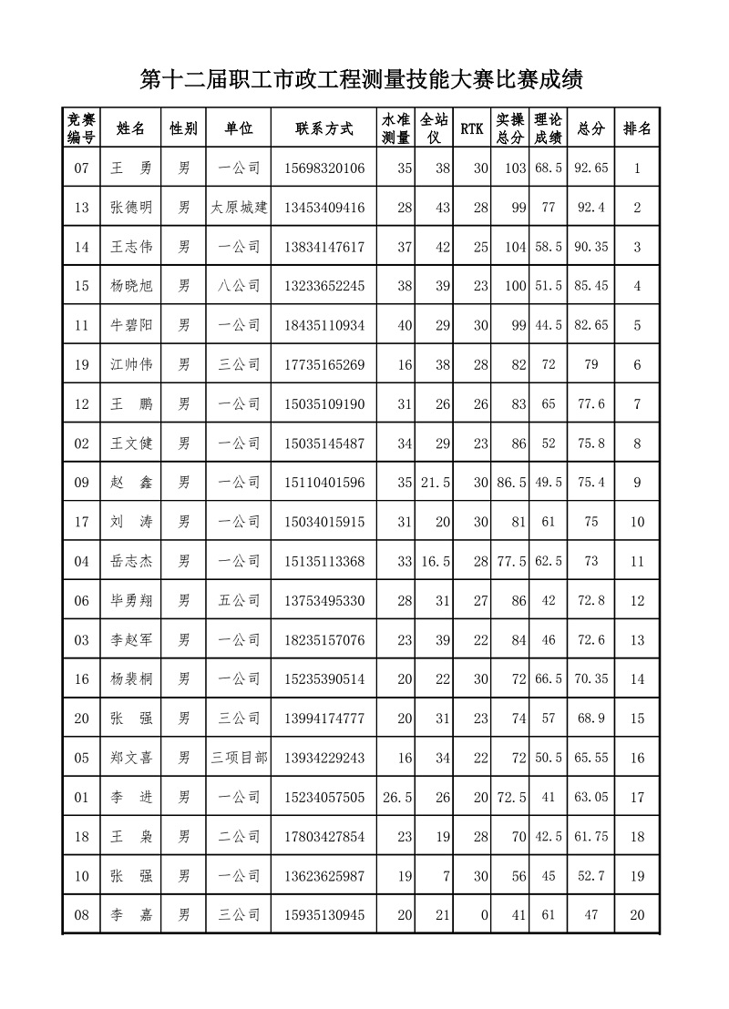 又訊:本屆市政工程測(cè)量放線員技能大賽,共有94名選手報(bào)名參賽,大賽分為理論和實(shí)操兩部分。理論考試獲得前20名的選手進(jìn)入實(shí)際操作比賽。經(jīng)過(guò)一天的角逐,裁判組根據(jù)選手現(xiàn)場(chǎng)操作情況進(jìn)行綜合評(píng)判、打分。每位選手最終成績(jī)由30%的理論成績(jī)和70%的實(shí)操成績(jī)組成,最終決出前16名,其中榮獲前6名的選手將報(bào)請(qǐng)市勞動(dòng)競(jìng)賽委員會(huì)給予記功表彰,7-16名的選手頒發(fā)“優(yōu)秀選手”榮譽(yù)證書(shū)。