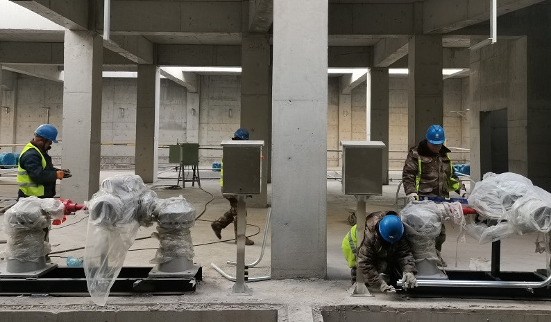該工程作為太原市最大的地下雨水泵站,工程設(shè)備數(shù)量多、單體體積大、安裝工作體量大、工藝繁雜。為了后期對(duì)蓄水池底部的沉渣進(jìn)行沖洗,工程中安裝使用了國(guó)際先進(jìn)的水洗門,此設(shè)備與墻體的密閉性要求較高,安裝精度需要控制在±2毫米以內(nèi)。項(xiàng)目部多次與設(shè)計(jì)人員、設(shè)備廠家、技術(shù)指導(dǎo)人員、施工人員進(jìn)行溝通交流,針對(duì)施工中的技術(shù)難點(diǎn),確定合理施工方案,廠家技術(shù)人員全程現(xiàn)場(chǎng)觀察、指導(dǎo)。施工人員嚴(yán)謹(jǐn)細(xì)致,確保安裝設(shè)備的平整度和水平度,并根據(jù)廠家技術(shù)人員建議調(diào)整施工細(xì)節(jié),保證了施工的準(zhǔn)確性。同時(shí)項(xiàng)目部加強(qiáng)現(xiàn)場(chǎng)監(jiān)護(hù)、安全隱患排查、巡查管理,對(duì)檢查中發(fā)現(xiàn)的問題及安全隱患,及時(shí)跟蹤,并落實(shí)整改,全力保障施工安全。
