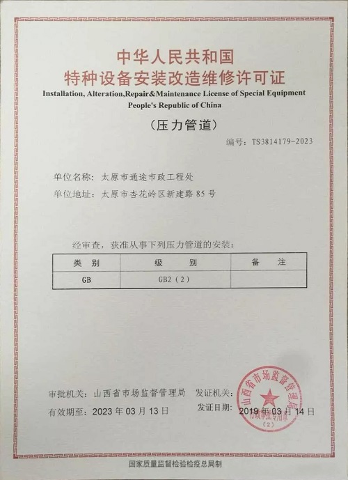 通途市政工程處喜獲山西省市場(chǎng)監(jiān)督管理局頒發(fā)的中華人民共和國特種設(shè)備安裝改造維修許可證