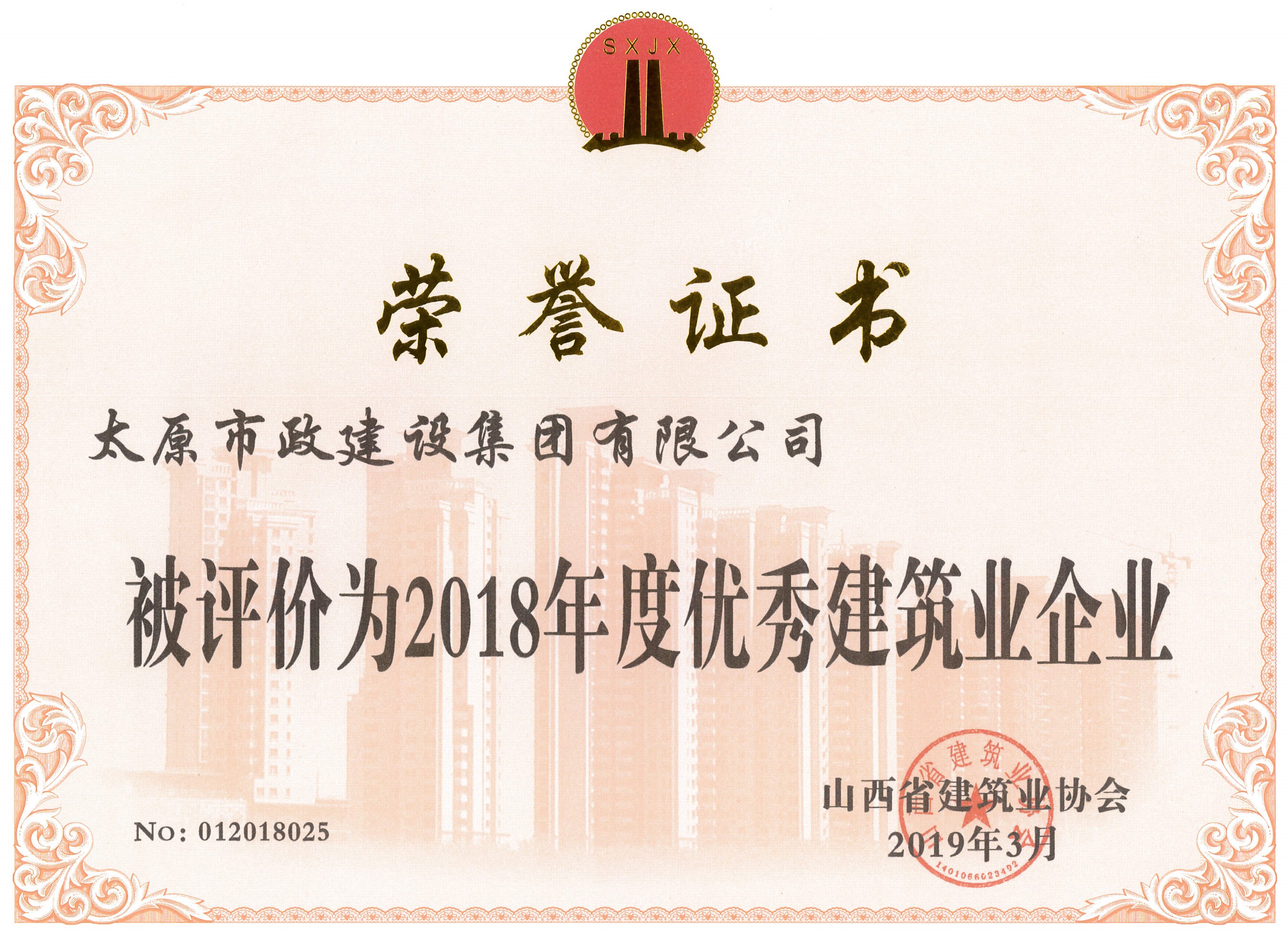 4月19日,太原市政建設(shè)集團(tuán)有限公司被山西省建筑業(yè)協(xié)會評價為2018年度建筑業(yè)企業(yè)優(yōu)秀等級。