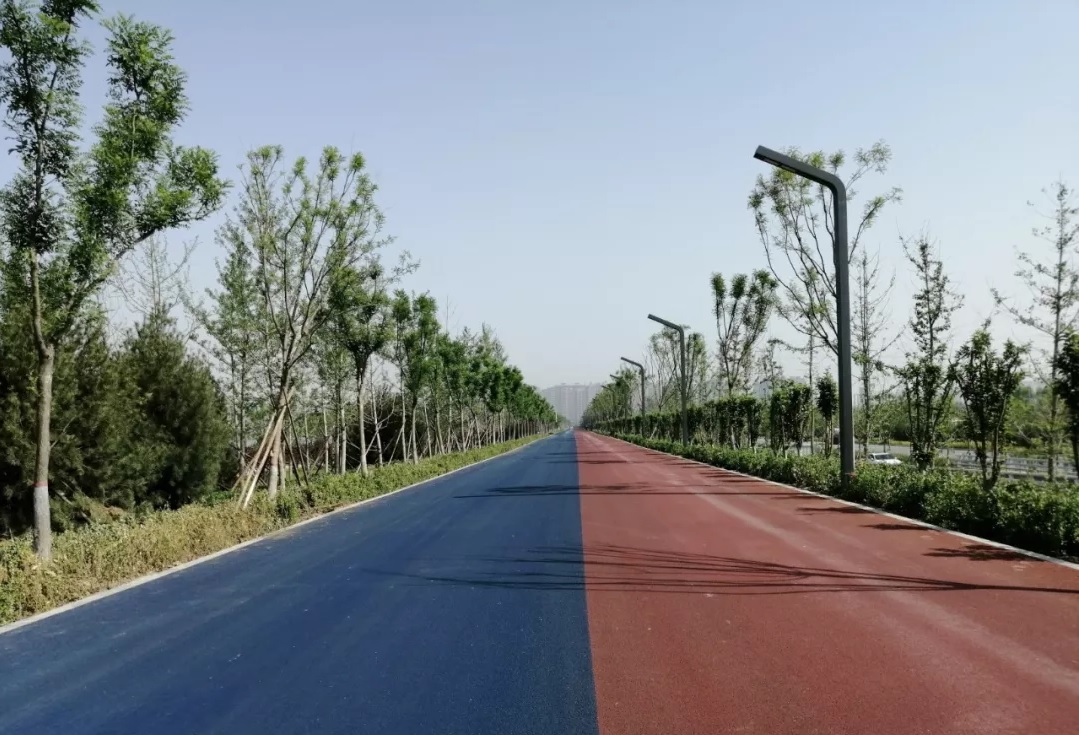 在道路鋪設(shè)過程中,為契合“二青”會(huì)體育精神,項(xiàng)目部在該工程面層鋪設(shè)彩色瀝青,不僅使路面更加干凈美觀,也為場(chǎng)館周邊道路增添一抹運(yùn)動(dòng)色彩。由于東大堤頂涉及國(guó)際自行車賽道,項(xiàng)目部制定可行性方案,在1、2號(hào)出入口施工中,采用墻端倒圓角處理,確保交通安全順暢。工程建設(shè)中,項(xiàng)目部全體參建人員不忘初心,堅(jiān)守使命,以熱情燃燒“卡路里”,助力品質(zhì)工程建設(shè)。