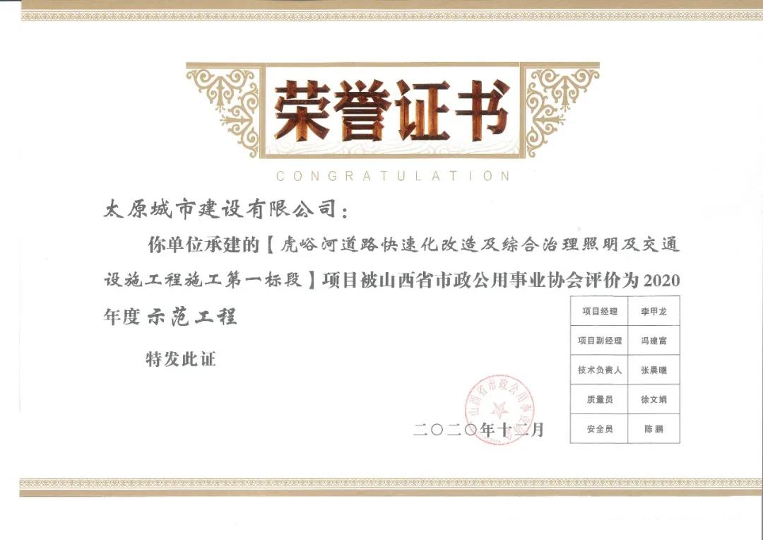 近日,太原城建公司承建的虎峪河道路快速化改造及綜合治理照明及交通設(shè)施工程施工一標(biāo)段被山西省市政公用事業(yè)協(xié)會評為“2020年度示范工程”。李甲龍?jiān)?020年度山西省市政公用事業(yè)協(xié)會市政工程項(xiàng)目經(jīng)理評價活動中被評為“優(yōu)秀項(xiàng)目經(jīng)理”。